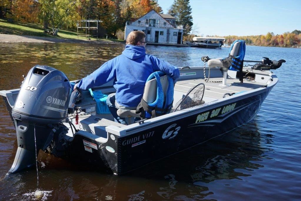 2017, 17'-7", tiller with 60hp Yamaha 4 stroke. Tiller steer boat with pedestal seats, Minnkota bow mount trolling motor and Lowrance 5 locator