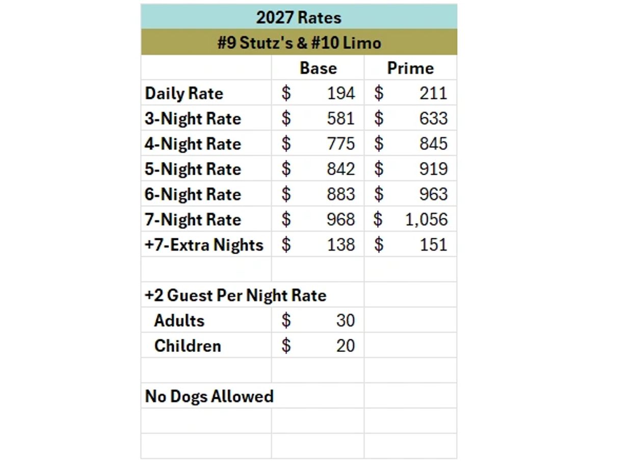 Stutz-Bearcat is part of a 3-unit complex, consisting of the South, bottom half, of the complex. Is a large efficiency that sleep up to 3 persons with one single and one queen bed. Has a kitchen, dining and eating space along with a very large bathroom. Was remodeled in 2022. Has a deck with a gas grill.